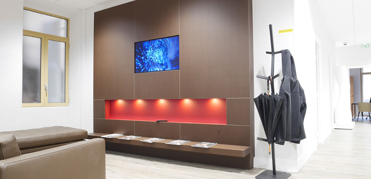 Mobilier mural avec intégration d’une TV et niche à prospectus en stratifié framboise avec installation de spots dans la zone d’accueil. Mobilier de rangement en mélaminé wengé pour l’espace bureaux.